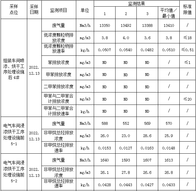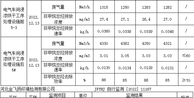 電氣車間浸漆烘干工序處理設(shè)施后5#非甲烷總烴排放滿足《工業(yè)企業(yè)揮發(fā)性有機物排放控制標(biāo)準(zhǔn)》(DB13/2322-2016)表1表面涂裝業(yè)非甲烷總烴排放濃度≤60mg/m3,最低去除效率≥70%;苯排放濃度滿足《工業(yè)企業(yè)揮發(fā)性有機物排放控制標(biāo)準(zhǔn)》(DB13/2322-2016)表1表面涂裝業(yè)標(biāo)準(zhǔn)限值≤1mg/m3;甲苯與二甲苯合計排放濃度滿足《工業(yè)企業(yè)揮發(fā)性有機物排放控制標(biāo)準(zhǔn)》(DB13/2322-2016)表1表面涂裝業(yè)排放限值:≤20mg/m3。