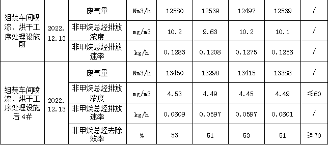 高壓車間噴漆工序處理設(shè)施后2#、組裝車間噴漆、烘干工序處理設(shè)施后4#顆粒物排放濃度滿足《大氣污染物綜合排放標(biāo)準(zhǔn)》(GB16297-1996)表2有組織顆粒物(染料塵)排放濃度<18mg/m3、二級排放速率≤0.51kg/h的標(biāo)準(zhǔn)要求;非甲烷總烴排放滿足《工業(yè)企業(yè)揮發(fā)性有機物排放控制標(biāo)準(zhǔn)》(DB13/2322-2016)表1表面涂裝業(yè)非甲烷總烴排放濃度≤60mg/m3,但不滿足最低去除效率≥70%的要求,故加測車間口無組織非甲烷總烴的濃度;苯排放濃度滿足《工業(yè)企業(yè)揮發(fā)性有機物排放控制標(biāo)準(zhǔn)》(DB13/2322-2016)表1表面涂裝業(yè)標(biāo)準(zhǔn)限值≤1mg/㎡3;甲苯與二甲苯合計排放濃度滿足《工業(yè)企業(yè)揮發(fā)性有機物排放控制標(biāo)準(zhǔn)》(DB13/2322-2016)表1表面涂裝業(yè)排放限值:≤20mg/m3。