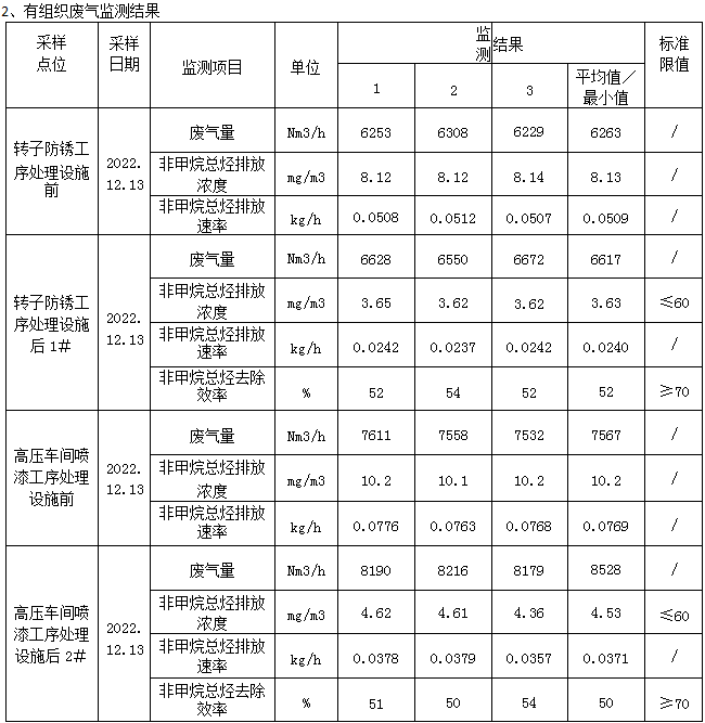 轉(zhuǎn)子防銹工序處理設(shè)施后1#非甲烷總烴排放滿足《工業(yè)企業(yè)揮發(fā)性有機物排放控制標(biāo)準(zhǔn)》(DB13/2322-2016)表1表面涂裝業(yè)非甲烷總烴排放濃度≤60mg/m3,但不滿足最低去除效率≥70%的要求,故加測車間口無組織非甲烷總烴的濃度。