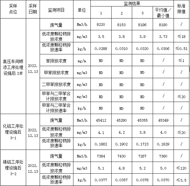 化鋁工序處理設(shè)施后3-1顆粒物排放濃度滿足《區(qū)域性大氣大氣污染物綜合排放標(biāo)準(zhǔn)》(DB37/2376-2019)中表1大氣污染物排放濃度限值≤20mg/m;鑄鋁工序處理設(shè)施后3-2顆粒物排放濃度執(zhí)行《大氣污染物綜合排放標(biāo)準(zhǔn)》(GB16297-1996)表2中二級標(biāo)準(zhǔn)排放濃度≤120mg/m3、排放速率≤3.5kg/h。