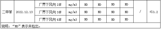 廠界下風(fēng)向甲苯排放濃度滿足《工業(yè)企業(yè)揮發(fā)性有機物排放控制標(biāo)準(zhǔn)》(DB13/2322-2016)表2中其他行業(yè)標(biāo)準(zhǔn)限值≤0.6mg/m3;廠界下風(fēng)向二甲苯排放濃度滿足《工業(yè)企業(yè)揮發(fā)性有機物排放控制標(biāo)準(zhǔn)》(DB13/2322-2016)表2中其他行業(yè)標(biāo)準(zhǔn)限值≤0.2mg/m3。