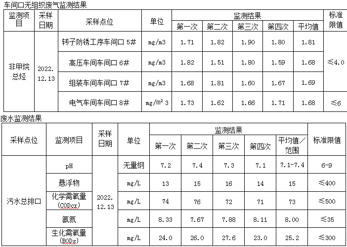 轉(zhuǎn)子防銹工序車間口、高壓車間車間口、組裝車間車間口非甲烷總烴排放滿足《工業(yè)企業(yè)揮發(fā)性有機物排放控制標(biāo)準(zhǔn)》(DB13/2322-2016)表3及《揮發(fā)性有機物無組織排放控制標(biāo)準(zhǔn)》(GB37822-2019)附錄A廠區(qū)內(nèi)VOCs無組織特別排放限值要求≤4.0mg/m3。電氣車間車間口非甲烷總烴排放滿足《揮發(fā)性有機物無組織排放控制標(biāo)準(zhǔn)》(GB37822-2019)附錄A廠區(qū)內(nèi)VOCs無組織特別排放限值要求≤6mg/m3。
